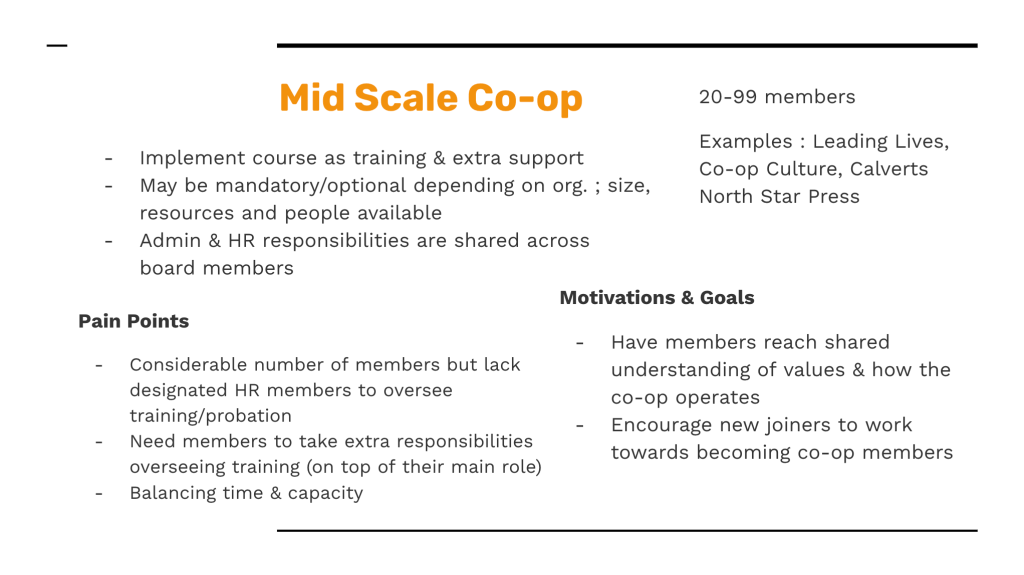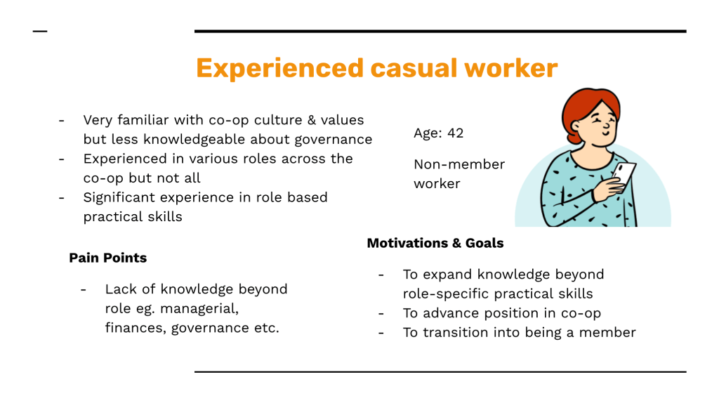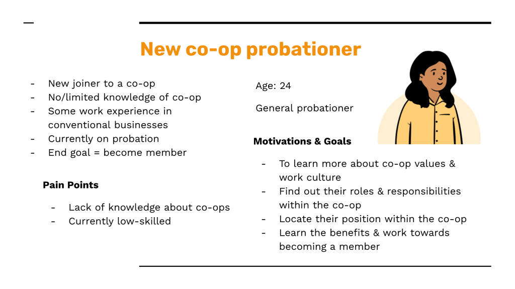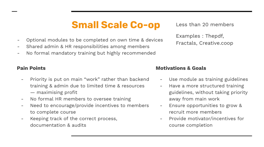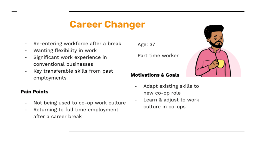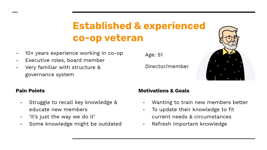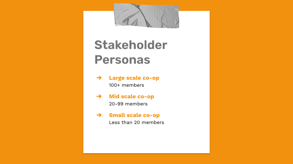 Since the ‘customers’ and ‘end users’ are different groups, I had to consider both of their needs and pain points. Thus stakeholder personas were also created to understand the various models of co-ops, and how the variety in scale can impact their capability and needs for the product.