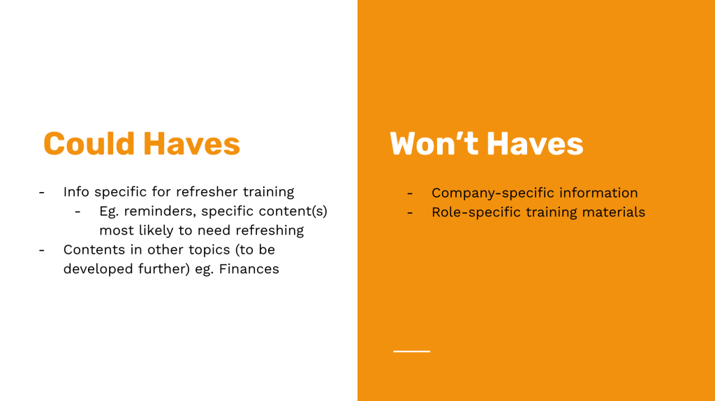 This allowed me to prioritise the key features essential to the MVP, and continue on the product development process. By communicating and updating the stakeholders regularly, I ensured that my work is fulfilling the client’s expectations and on track to a successful outcome.