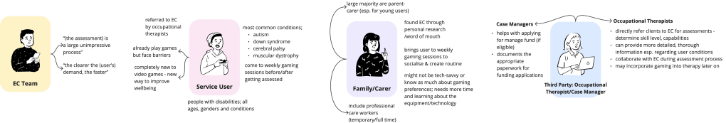 Although Everyone Can’s end ‘service user’ is the person with disability, they interact with a much wider group, including the family/carers of the user as well as third party professionals; case managers and occupational therapists who could refer users to them as a method of improving wellbeing and facilitating social connections.