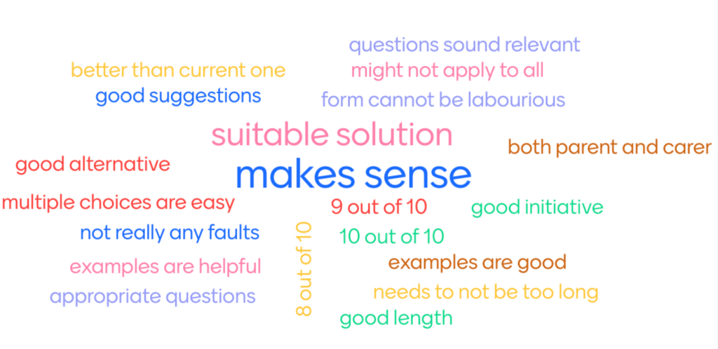 | P1 | parent-carer | suitable solution, form is a good length – no faults | 10/10 |