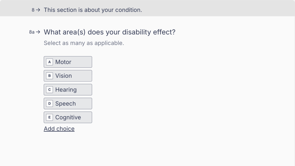 The MVP is a short Typeform survey aimed to collect essential preliminary information, and logic jumps were used to tailor the experience to each user case. Here are some examples;