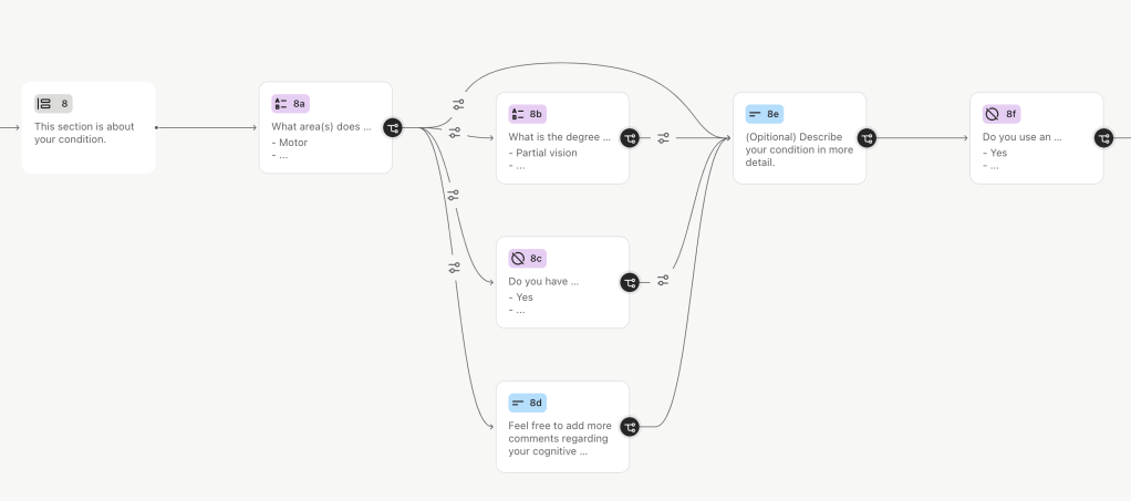 Before developing the MVP on Typeform, I created this user flow to map out the journey of the form and section questions